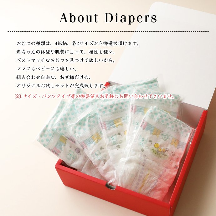 ※3枚ずつ4種類のおむつを選択OK。全て同種類も出来ますしお試しセットのように色々組み合わせる事も!