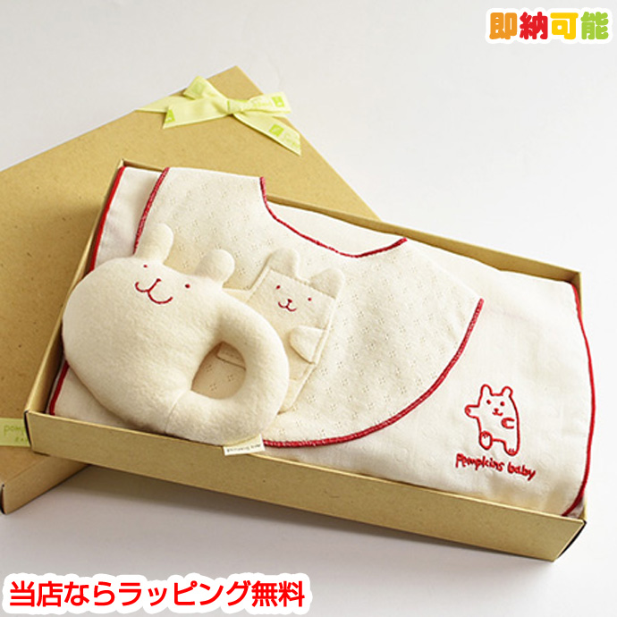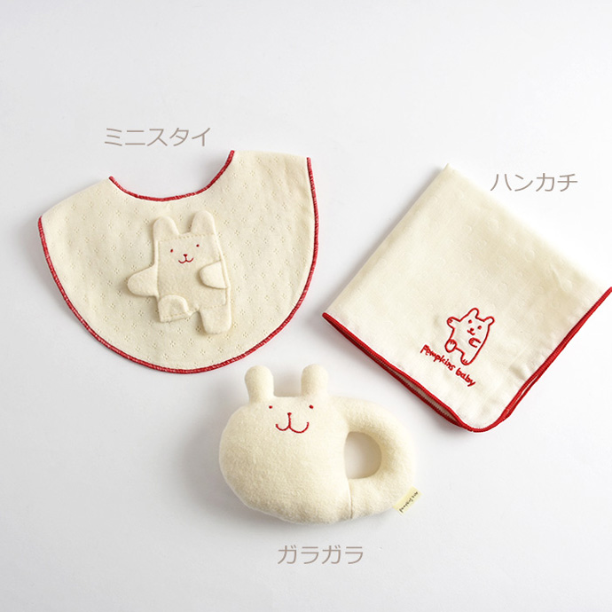 ガラガラ、ハンカチの3点セット。