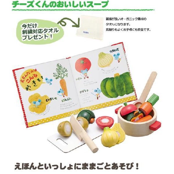 絵本を読みながら木のおもちゃで遊び、食育の最初の一歩としてもお役立てください。