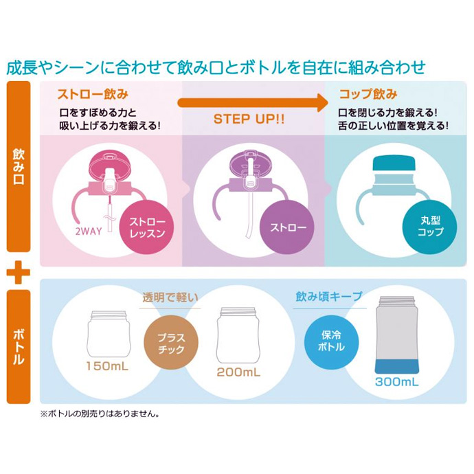 ストローの練習からストロー飲み、コップ飲みへのステップアップがスムーズです。
