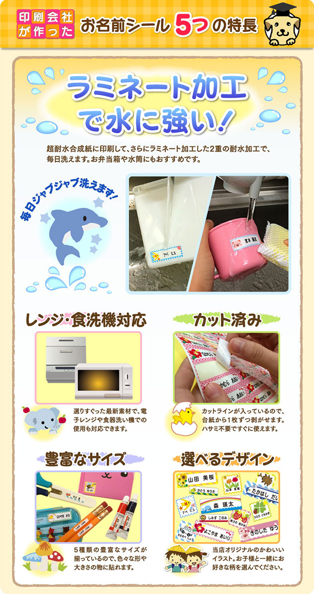 ラミネート加工で水に強く、レンジ・食洗機対応、耐水加工、とっても丈夫!