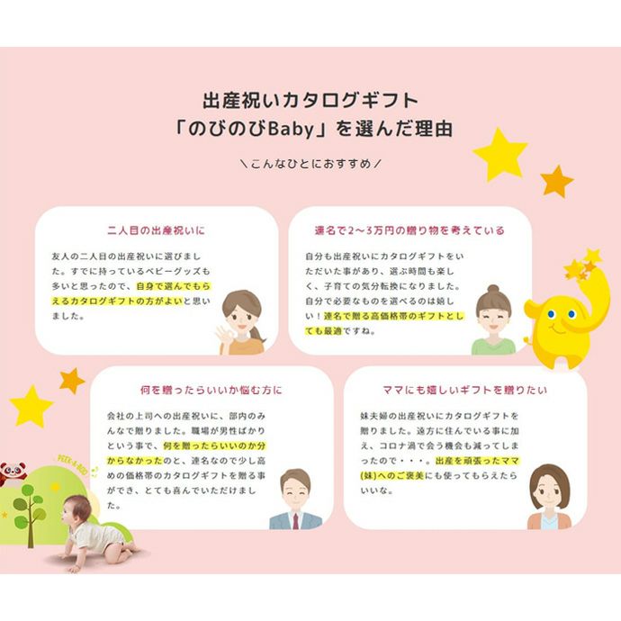 他の画像を見る 知育玩具 御歳暮 お歳暮 お年賀 引き出物 出産内祝い 結婚祝い 香典返し 誕生日プレゼント 出産祝い専用カタログギフト カタログギフト 出産祝い のびのびbaby 選べる全5コース ギフト 贈り物 カタログ プレゼント 出産 産後ママ 誕生日 ベビー 赤ちゃん 子供 キッズ おもちゃ 用品 男の子 女の子 ギフトセット ラッピング対応 誕生日 赤ちゃん 子供 出産 ベイビー クリスマス ハロウィン バレンタイン 七五三 初節句 子供の日 当店特別価格 ¥ 4,640 税込 〜 当店特別価格 ¥ 税込 詳細を見る お気に入りに登録する